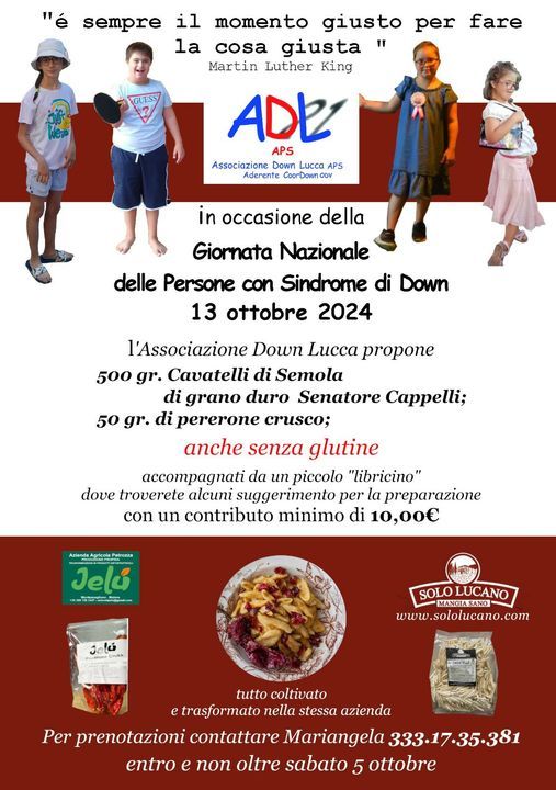 L'occasione, per chi desidererà contribuire, sarà quella della Giornata Nazionale delle Persone con Sindrome di Down il prossimo 13 ottobre in occasione della quale, già da domani e fino al 5 ottobre, sarà possibile, con un piccolo contributo, portare a casa gli ingredienti unici per la realizzazione di uno squisito piatto della tradizione regionale lucana. Anche senza glutine.